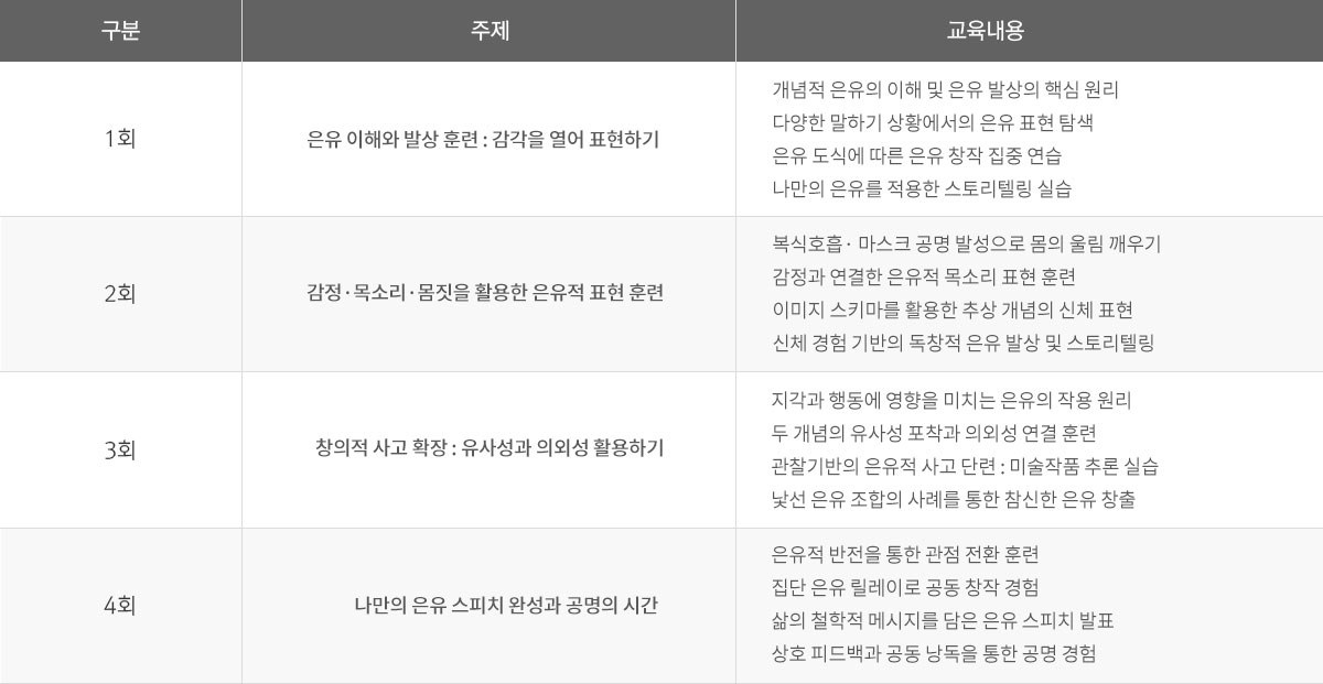 이 과정에서 여러분은 일상 속 언어를 새롭게 연결해 창의적 언어로 바꾸고, 목소리와 몸짓으로 감정을 살아있는 언어로 표현하며, 서로의 은유를 이어가며 공명과 확장을 경험합니다. 여정의 끝에는 자신의 철학과 삶을 담은 은유 스피치를 완성하게 됩니다.
