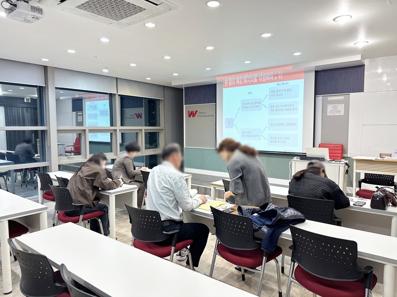 상대를 내 편으로 만드는 설득대화 특강 W스피치 부산센텀점에서 설득대화 특강이 진행되었습니다.설득이라고 하면 어렵고 부담스럽게 느껴질 수 있지만,이번 특강에서는 조금 더 편안한 방향에서 이야기를 풀어갔습니다.상대를 이기기 위한 말이 아니라, 자연스럽게 내 편이 되도록 만드는 스피치에 초점을 맞췄습니다.‘상대를 내 편으로 만드는 스피치’를 중심으로말의 내용뿐만 아니라 전달 방식과 구조까지 함께 다루며,실제 상황에서 바로 활용할 수 있는 방법들을 정리했습니다.듣는 사람의 마음을 여는 표현은 무엇인지,어떤 순간에 공감과 신뢰가 만들어지는지에 대해서도실습을 통해 직접 경험해보는 시간이었습니다.또한 귀에 쏙 들어오는 스토리텔링으로같은 내용도 더 쉽고 선명하게 전달하는 방법과,부담스럽지 않게 승낙을 이끌어내는 프레임 전략까지 함께 익혔습니다.편안한 분위기 속에서 자연스럽게 이야기가 이어지며,설득을 조금 더 가깝고 실용적으로 느껴볼 수 있었던 시간이었습니다.말의 방향이 조금만 달라져도 대화의 흐름과 관계는 충분히 달라질 수 있습니다.이번 특강이 그 변화를 시작하는 계기가 되었기를 바랍니다. 문의전화 : 1644-02081.서울강남점 2.부산센텀점 3.온라인클래스 4.기업교육