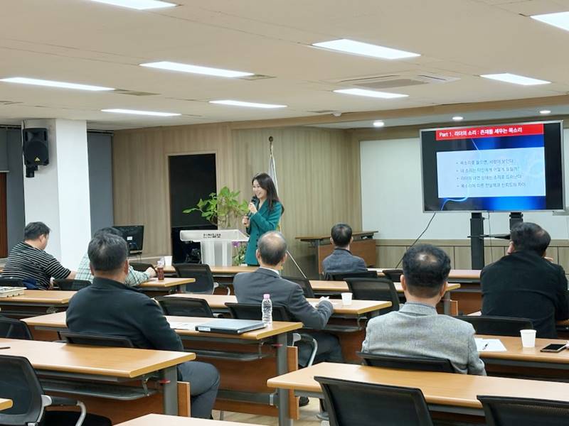 신문사 특강 CEO 아카데미 : 리더의 말은 품격이다. 이번 특강에서는 리더의 소리·몸·말을 통합적으로 인식하며품격 있는 커뮤니케이션 역량을 강화하는 것을 목표로자신의 목소리와 함께 강력하게 전달되는 비언어 메시지를 점검하고어떤 모습의 리더십을 발휘하고 있는지 탐구하는 시간을 가졌습니다. "말하기 하나가 조직 분위기를 바꿀 수 있다는 걸 깨달았다""공감과 리더의 언어가 중요한 이유를 느꼈다"라는 소감을 전해주셨습니다. 존재감 있는 리더십은 말에서 시작됩니다.이번 특강을 통해 긍정적 에너지와 품격 있는 커뮤니케이션 문화가조직 곳곳에서 밝게 자리 잡기를 기대합니다! 문의전화 1644-02081.서울강남점 2.부산센텀점 3.온라인클래스 4.기업교육문의
